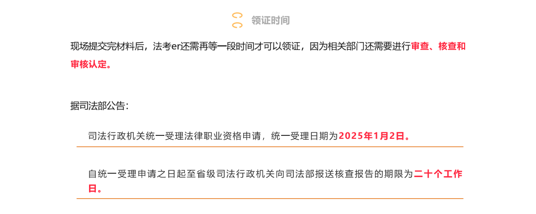 现场提交完材料后,法考er还需再等一段时间才可以领证,因为相关部门还需要进行审查、核查和审核认定。
