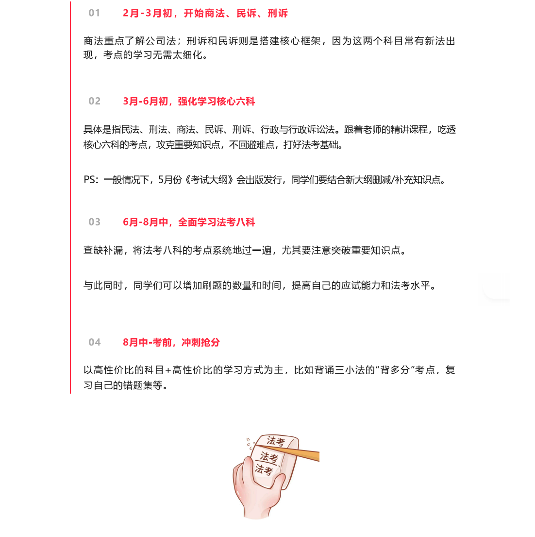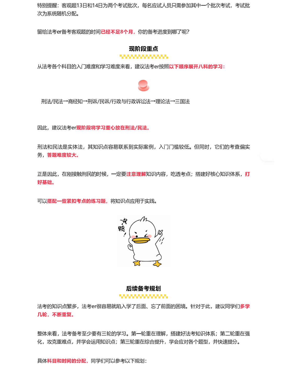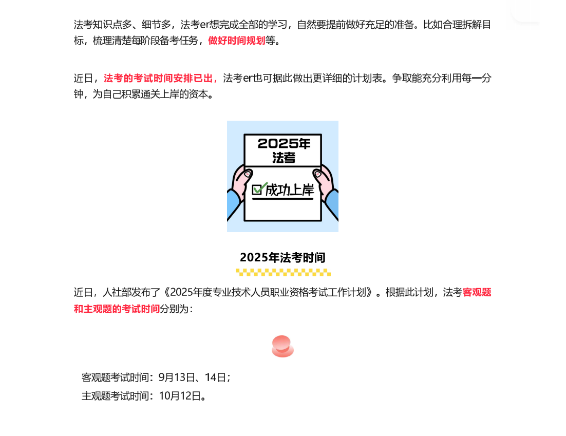法考er也可据此做出更详细的计划表。争取能充分利用每一分钟,近日,法考的考试时间安排已出,为自己积累通关上岸的资本。