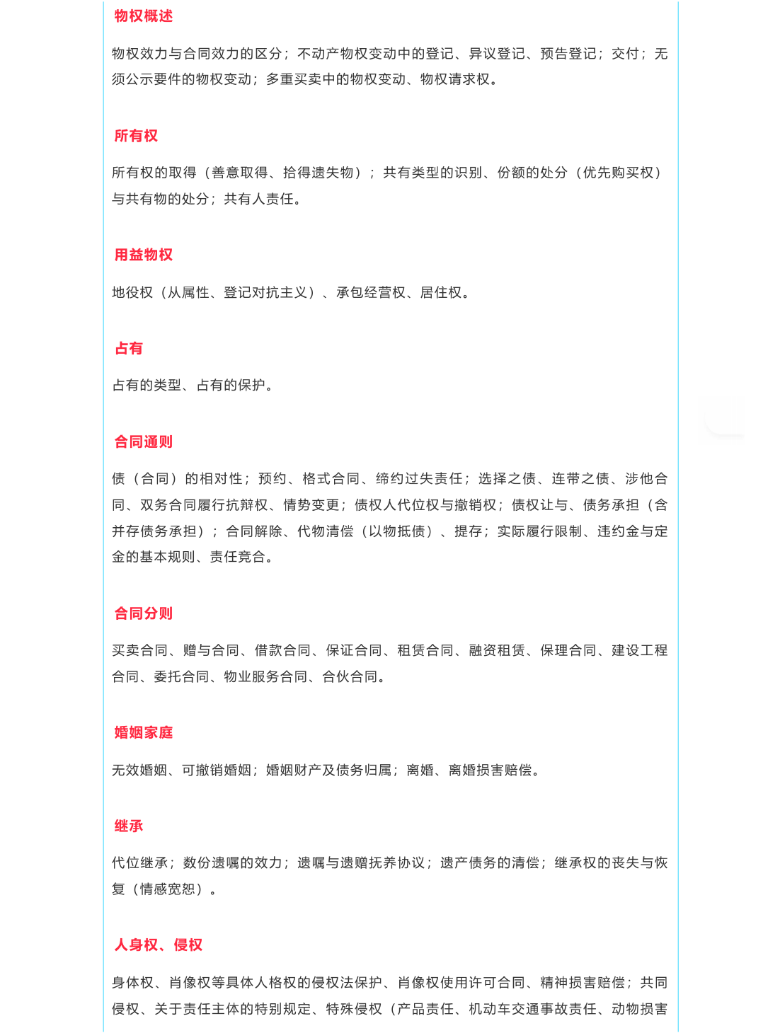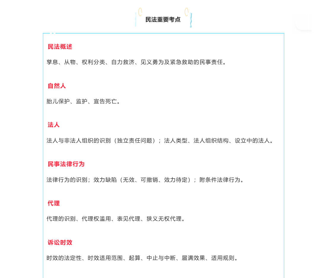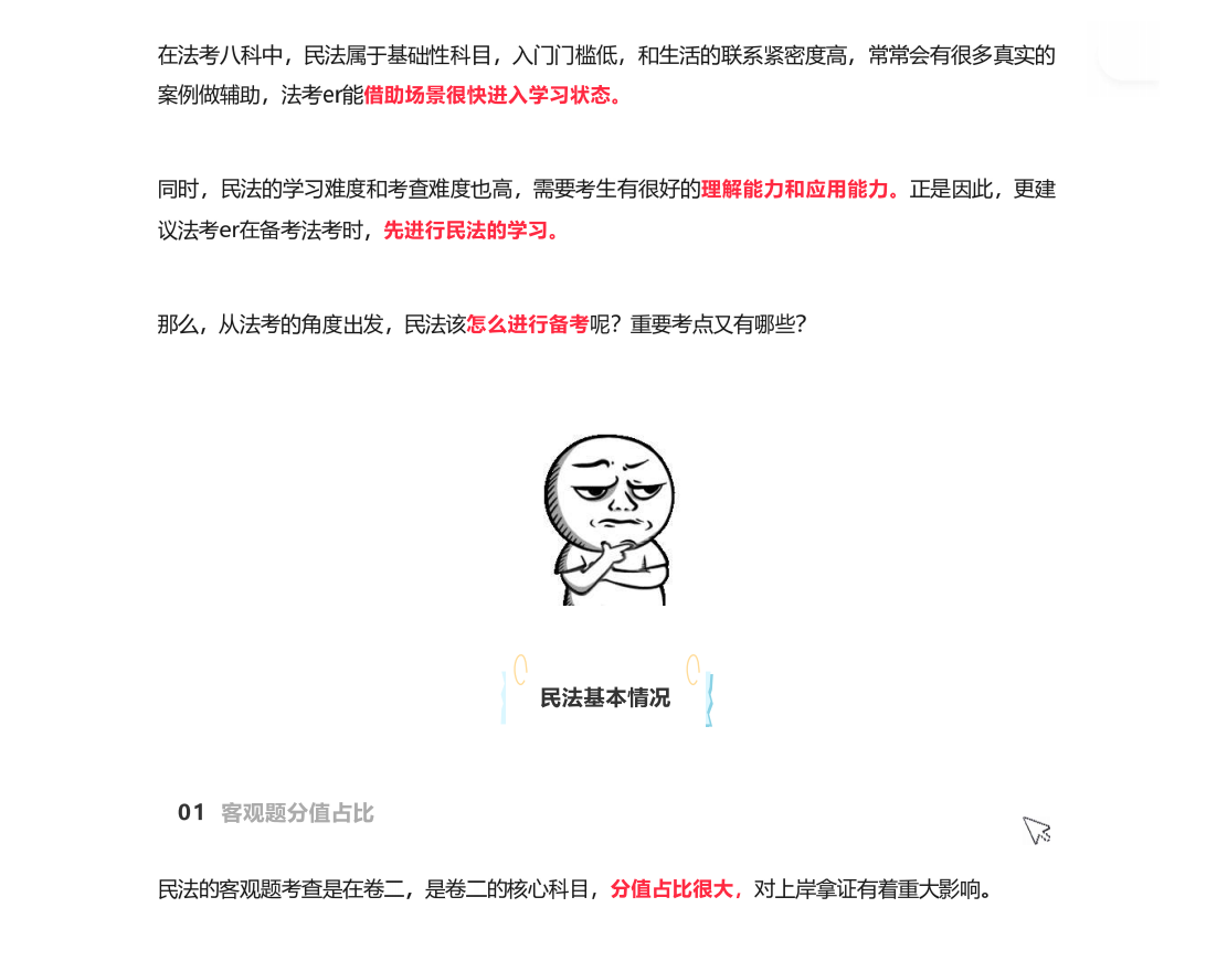 在法考八科中,民法属于基础性科目,入门门槛低,和生活的联系紧密度高,常常会有很多真实的案例做辅助,法考er能借助场景很快进入学习状态。 同时,民法的学习难度和考查难度也高,需要考生有很好的理解能力和应用能力。正是因此,更建议法考er在备考法考时,先进行民法的学习。