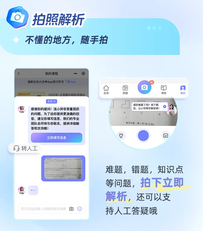 无论你身处何时何地,无论是纸质教辅资料上的难题,还是电子题库上的难题,法考er都能将它生成图片,询问法小伴,AI助手将迅速响应,为你答疑解惑。