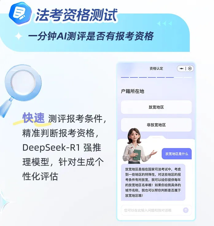 若有法学类专业、放宽地区、三年法律工作经验等问题,也可随时提问,AI助手将为你答疑解惑,帮助你做出更准确的判断。