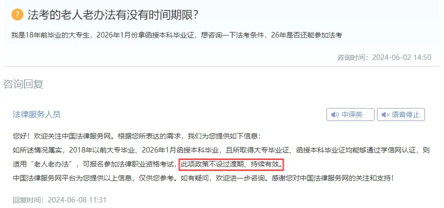答:如所述情况属实,2018年以前大专毕业、2026年1月函授本科毕业,且所取得大专毕业证、函授本科毕业证均能够通过学信网认证,则适用“老人老办法”,可报名参加法律职业资格考试,此项政策不设过渡期、持续有效。