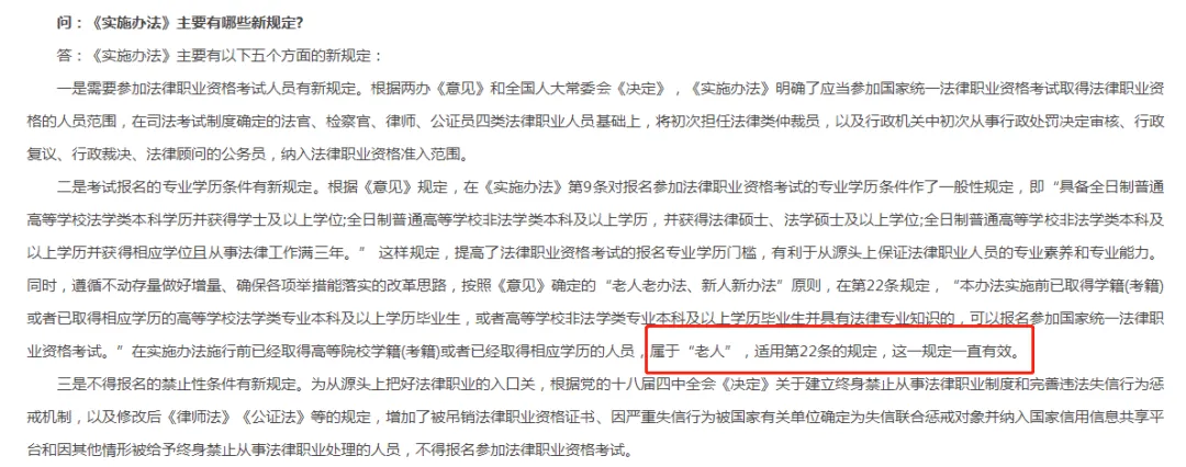 按照《意见》确定的“老人老办法、新人新办法”原则,在第22条规定,“本办法实施前已取得学籍(考籍)或者已取得相应学历的高等学校法学类专业本科及以上学历毕业生,或者高等学校非法学类专业本科及以上学历毕业生并具有法律专业知识的,可以报名参加国家统一法律职业资格考试。”在实施办法施行前已经取得高等院校学籍(考籍)或者已经取得相应学历的人员,属于“老人”,适用第22条的规定,这一规定一直有效。