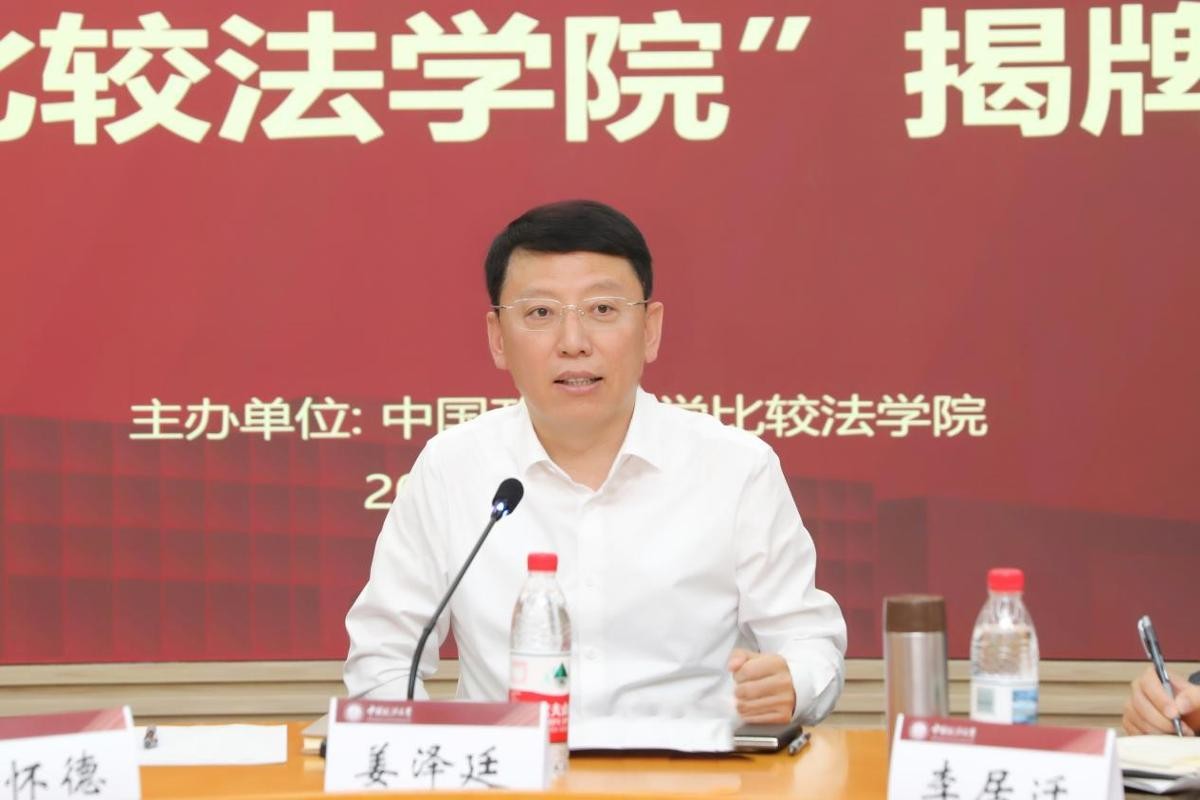 (姜泽廷致辞 摄影 尹建峰)姜泽廷指出,中国政法大学比较法学院正式揭牌是学校面向国家战略需求,在转型升级发展中的重要举措,是学校发展历程中的里程碑,是我国涉外法治教育事业迈向新高度的生动注脚。学校搭建“一中心多基地”融合发展布局,推动习近平法治思想研究和国际传播,开展以实践为导向的人才培养工作。姜泽廷强调,要将学校内部的全面深化综合改革工作与学校外部拉开发展框架、拓展发展空间,同服务国家战略深度融合,一体理解、一体推进。比较法学院要锚定全面赋能法学学科研究和涉外法治人才培养转型升级目标,围绕习近平法治思想的国际传播等重要任务,构建具有中国特色、国际视野、时代精神的比较法学学科体系,增强人才培养的针对性、适应性、有效性,将涉外法治人才培养推向新的高度。法大将与各兄弟院校同题共答,在建设更高水平的法治中国中作出更大贡献。