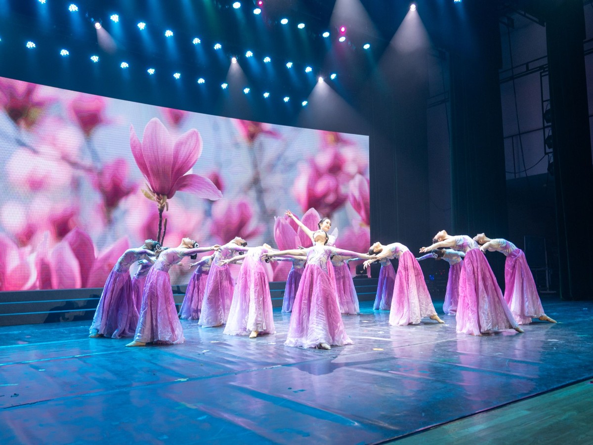 (原创舞蹈《玉兰芬芳》 摄影 张峻通)晚会创新运用艺术语言诠释法大精神。由83级至99级校友呈现的朗诵《足迹》,以时空对话形式再现法大人的奋斗历程;原创舞蹈《玉兰芬芳》以花瓣飘落象征法治精神的代际传承,通过刚柔并济的肢体语言展现法大文化的精神图谱。