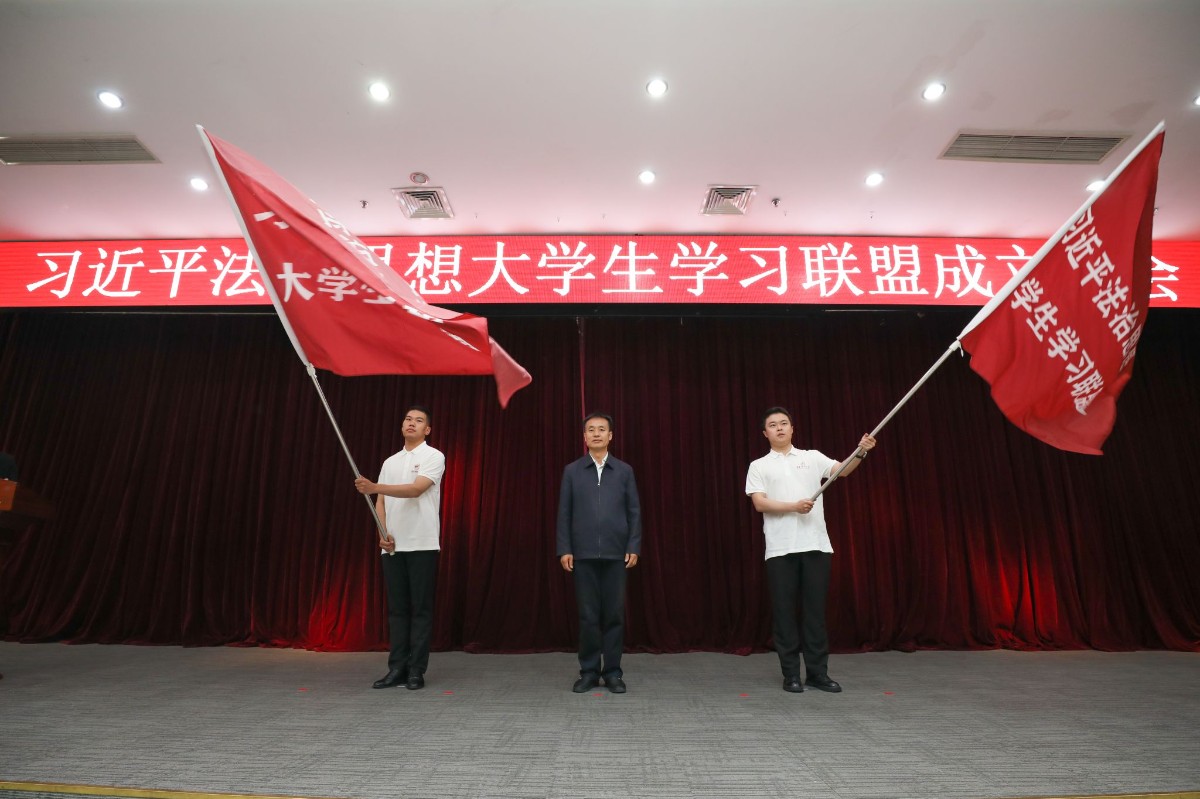 谢向红为联盟高校习近平法治思想学习中心及宣讲团学生代表授旗、为联盟专家库指导教师代表颁发聘书,“习近平法治思想大学生学习联盟”正式成立。