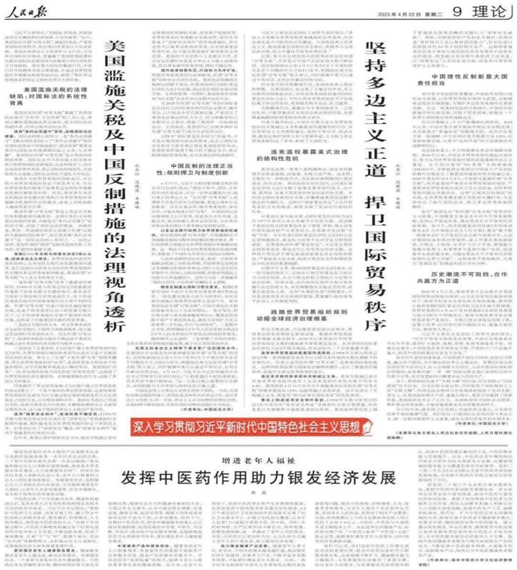 (《人民日报》理论版以双头条方式刊发我校教师文章)一方面,借力国家级媒体,打造重量级媒体传播矩阵。在推进习近平法治思想的国际传播方面,法大有着丰富的理论研究成果,但不可否认,作为一所高校,对外传播的力量较为薄弱。为突破这一限制,4、5月份,校领导带队集中拜访调研了人民日报社、新华社、光明日报社及《求是》杂志社,经过深入研究探讨,建立起校媒深度协同的传播机制。4月22日的《人民日报》理论版以双头条方式刊发我校孔庆江、范晓波、车路遥三位教授的解读文章,从法理视角透视美国滥施关税及中国反制措施,深入阐释我国对多边主义和国际贸易秩序的捍卫;文章同期在《环球时报》英文版刊发,在国内外产生广泛影响。实践证明,这是一次成功的习近平法治思想国际传播的尝试,彰显了校媒协同下“学术研究、成果转化、国际传播”一体化机制的创新优势。未来,学校将与人民日报社、新华社、光明日报社、《求是》杂志社等国家级媒体平台深入合作,将有组织的科研与有组织的国内外传播深度融合,通过共办研讨会、共推理论文章、共设成果专栏,共研多语种产品等形式,借助国家级媒体的传播实力和传播渠道推动习近平法治思想“破圈”传播、走出国门,彰显习近平法治思想的时代影响力。