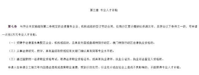 《广州市南沙区促进法律服务集聚区高质量发展扶持办法实施细则(2025年修订版)》明确:与符合本实施细则第二条规定的法律服务企业、机构或组织签订劳动合同,在南沙区累计缴纳社保满三年,且符合以下条件之一的,可申请一次性3万元专业人才补贴: