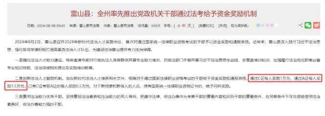 《雷山县:全州率先推出党政机关干部通过法考给予资金奖励机制》提出,创新法治人才激励机制,出台新时代法治人才培养相关文件,明确对于通过国家法律职业资格考试的干部给予资金奖励和通报表扬。通过C证每人奖励1万元,通过A证每人奖励1.5万元,已有C证考取A证的每人奖励0.5万元,对于新招录和新调入的人员,给予同样奖励。