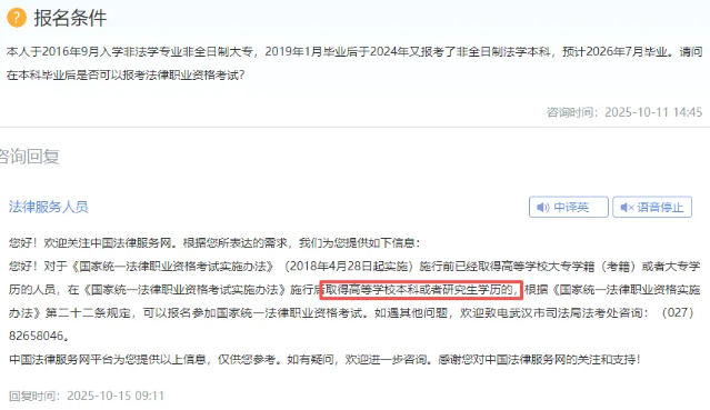 这便是我们常说的“老人老办法”:2018年4月28日前已入学高等学校(包含专科)的,本科及以上学历即可报名法考。无论是否全日制,不限专业!