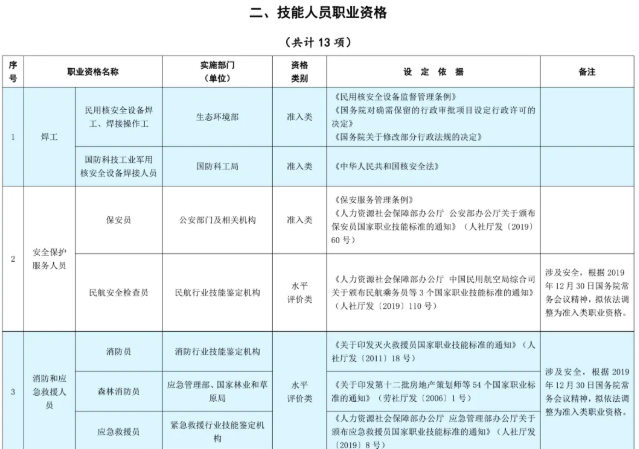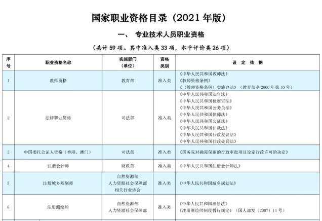 根据《国家职业资格目录(2021年版)》,专业技术人员职业资格共计59项,其中准入类33项,水平评价类26项;技能人员职业资格共计13项。