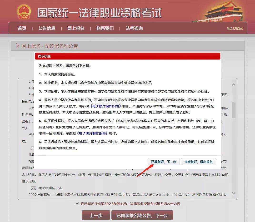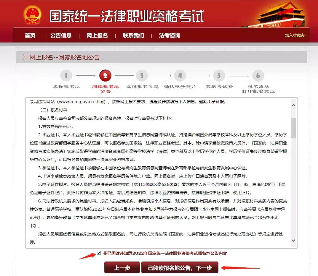 勾选“我已阅读并知悉2022年国家统一法律职业资格考试报名地公告内容”