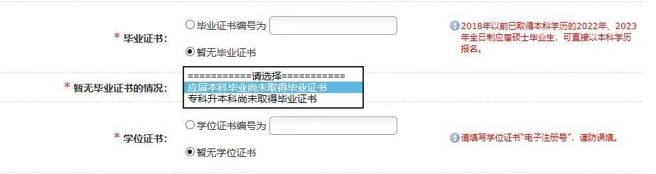 还未拿到证书的,选“暂无毕业证编号”,随后如实选择暂无毕业证的情况即可。