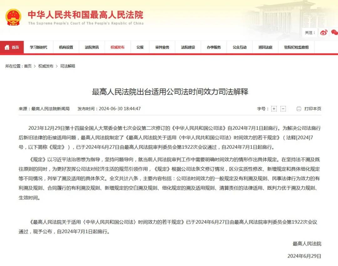 《最高人民法院关于适用〈中华人民共和国公司法〉时间效力的若干规定》已于2024年6月27日由最高人民法院审判委员会第1922次会议通过,现予公布,自2024年7月1日起施行。