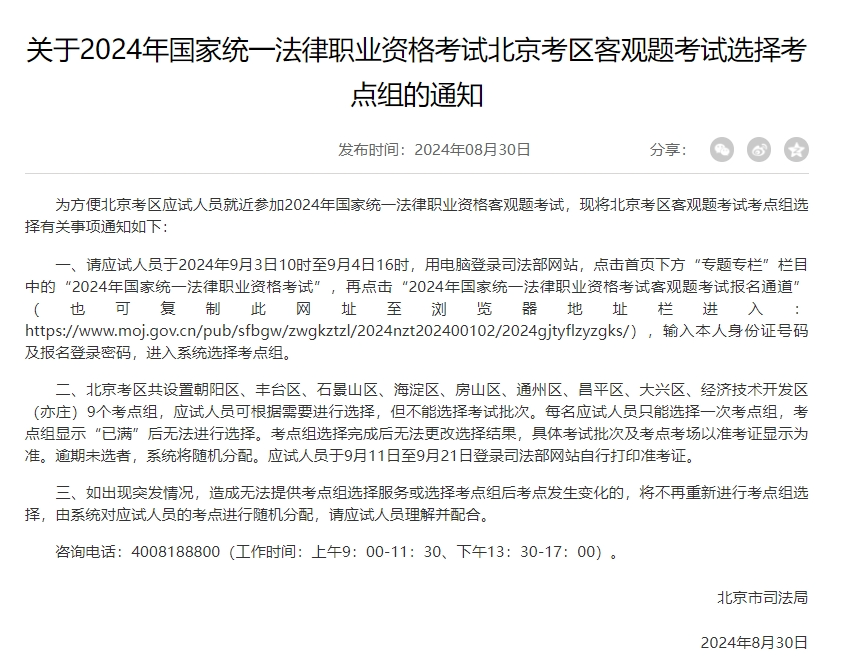 为方便北京考区应试人员就近参加2024年国家统一法律职业资格客观题考试,现将北京考区客观题考试考点组选择有关事项通知如下: