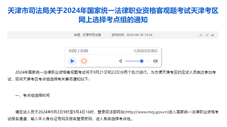 2024年国家统一法律职业资格客观题考试将于9月21日和22日分两个批次进行。为方便天津考区的应试人员就近参加考试,现将天津考区考点组选择有关事项通知如下: