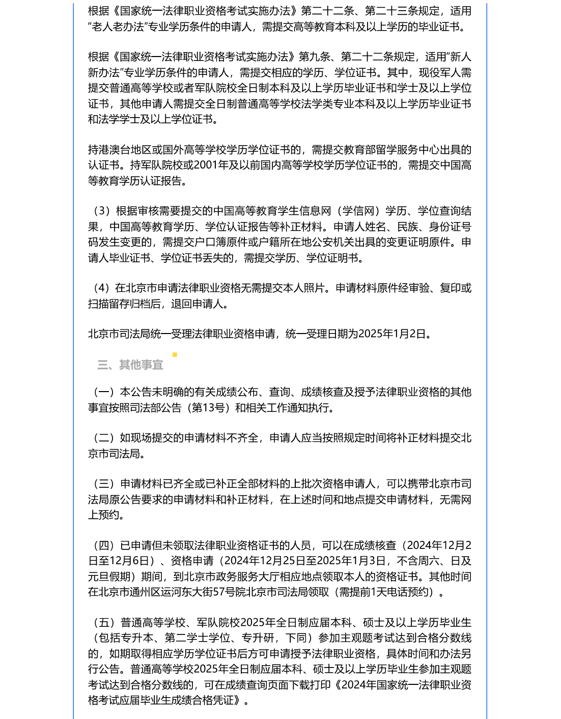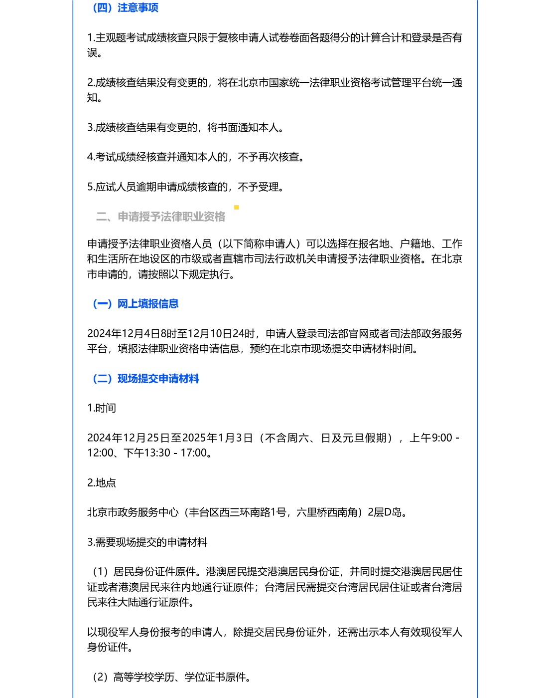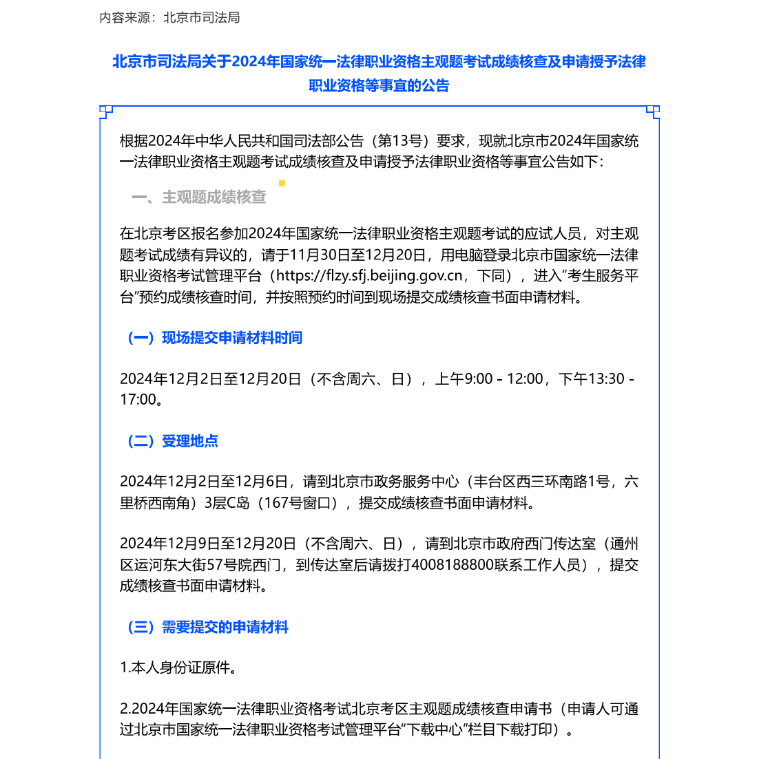 北京市司法局关于2024年国家统一法律职业资格主观题考试成绩核查及申请授予法律职业资格等事宜的公告
